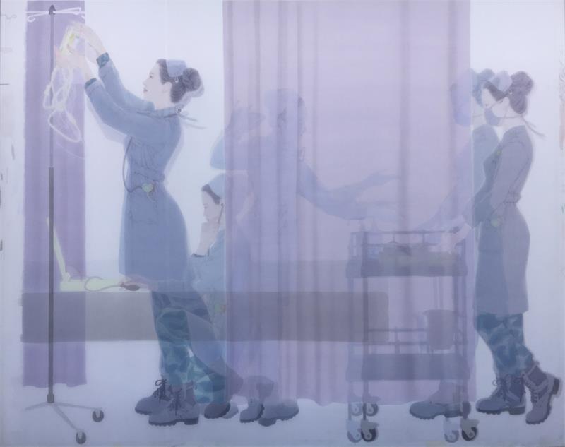 《无悔青春·援》 168cmx199cm 绢本淡彩 在中国美术馆展出“庆祝建军90周年全国美展”暨“13届全军美展”,并被中国美术馆收藏(最高奖)